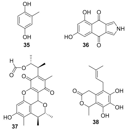 In 2016, M García-Caballero et al. reported that toluquinol (35, Figure 12), isolated from the marine fungus Penicillium sp. HL-85-ALS5-R004, inhibited the phosphorylation of p-Akt and p-ERK1/2 in vitro and VEGF-C-induced lymphatic vessel formation and corneal neovascularization in mice [54]. Compound 35 plays a demonstrated role in inhibiting angiogenesis and lymphangiogenesis, which is meaningful in connection with the implications of tumour-induced lymphangiogenesis and lymphatic metastasis. In 2016, Bin Wu et al. reported on biscogniauxone (36, 12), a new isopyrrolonaphthoquinone isolated from the deep-sea (2800 m) fungus Biscogniauxia mediterranea [55]. Compound 36 moderately inhibited GSK-3β (IC50 = 8.04 μM) and had almost negligible antibacterial activity against Staphylococcus epidermidis and methicillin-resistant S. aureus (IC50 ~ 100 μM) [55]. Marine-derived fungi from the deep sea are promising but severely under-studied biological resources, and these possess abundant novel and bioactive secondary metabolites that urgently need to be mined if adequate access to the resource can be obtained [57]. In 2017, Nguyen Thi Thanh Ngan et al. reported that citrinin H1 (compound 37, Figure 12), isolated from the marine fungal strain Penicillium sp. SF-5629, inhibited p-p38 MAPK expression in vitro [56]. Additionally in 2017, Marion Navarri et al. reported that dihydrosecofuscin (compound 38, Figure 12), isolated from a deep-sea (765 m) fungus Oidiodendron griseum UBOCC-A-114129, inhibited CLK1 (IC50 = 15.6 μg/mL) [58]. Compound 38 showed weak antibacterial activities (MIC ~ 100 μg/mL) against Gram-positive bacteria, and the authors noted a potential use of this CLK1 inhibitor for the treatment of Alzheimer’s due to the connection between the particular kinase and disease [58].