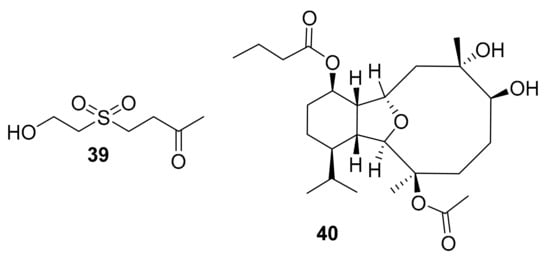 In the time period covered in this review, two new natural product kinase inhibitors (39 and 40) were reported after being isolated from marine soft coral (see Table 3). Dihydroaustrasulfone alcohol (39, Figure 13), is a molecule that was reported in 2015 by Pei-Chuan Li et al. after being isolated from soft corals [59]. This compound inhibited ERK/MAPK and PI3K/AKT, and was suggested as a lead that could be pursued for the prevention and treatment of arterial restenosis [59]. In 2017, pachycladin A (40, Figure 13) was re-isolated from the soft coral Cladiella pachyclados found in the Red Sea, and a newly shown activity (absent from the previous report of this compound in 2010 [61]) was that it inhibited two members of the EGFR family when screened at 10 μM [60].