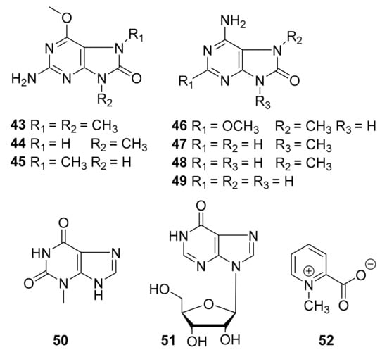 Structures of purine and pyridine alkaloids (43–52).