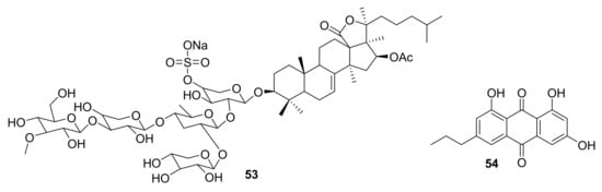 In 2017, frondoside A (compound 53, Figure 16) was isolated from Cucumaria frondosa, the Atlantic sea cucumber, and reported as being an effective inhibitor of PAK1 (IC50 ~ 1.2 μM), LIMK (IC50 ~ 60 μM), AKT (IC50 ~ 59 μM) and A549 lung cancer cells (IC50 ~ 1–3 μM) in vitro, indicating that it may be useful in the treatment of malignancies [64,65]. Additionally in 2017, the molecule 1-deoxyrhodoptilometrin (compound 54, Figure 16), which was first discovered by Wright et al. from the Echinoderm Colobometra perspinosa [67], was re-isolated from the marine echinoderm Comanthus sp. [66]. This compound was subsequently reported to inhibit the IGF1-R kinase, focal adhesion kinase, and EGF receptor kinase with IC50 = 5, 8.4 and 4 μM, respectively [66].
