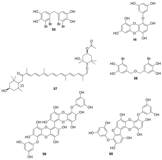 In 2015, Shuai-Yu Wang et al. reported compound 55 (Figure 17) as a multi-target RTKs inhibitor such as FGFR2, FGFR3, VEGFR2 and PDGFR-α (with in vitro inhibition rates of 57.7%, 78.6%, 78.5% and 71.1%, respectively), which was isolated from Rhodomela confervoides, a red alga, and this molecule also inhibits p-PKB/Akt [68,69]. Compound 55 may accordingly present a scaffold from which to develop new multi-target RTKs inhibitors. In 2017, Sung-Hwan Eom et al. reported that the polyphenolic molecule eckol (56, Figure 17), purified from the edible brown seaweed Eisenia bicyclis, inhibited Propionibacterium acnes mediated phosphorylation of Akt [70]. Eckol is also proposed as an anti-inflammatory agent and antioxidant. In 2017, fucoxanthin (57, Figure 17), a well-known marine carotenoid, was shown to inhibit Akt/NF-κB and involved MAPK pathways in vitro, suggesting that it could be a potential therapeutic agent acting by this mechanism for the therapy of neurodegenerative diseases [71,72,73]. Further validation studies are obviously necessary, and likely ongoing. In 2018, Youn Kyung Choi et al. reported the isolation of bis (3-bromo-4,5-dihydroxybenzyl) ether (58, Figure 17) from Polysiphonia morrowii, a red alga [74]. Compound 58 selectively inhibited p-ERK, demonstrating that it could have potential in the treatment of inflammatory diseases [74]. In 2014, Paudel et al. postulated that since the polyphenolics 6–6 bieckol and pholorofucofuroeckol A (59 and 60, Figure 17) inhibited p-ERK1/2 and p-JNK activation, these hold potential value for treating pulpitis and oral diseases [75]. These two compounds were isolated from Eisenia bicyclis, a brown alga [75].