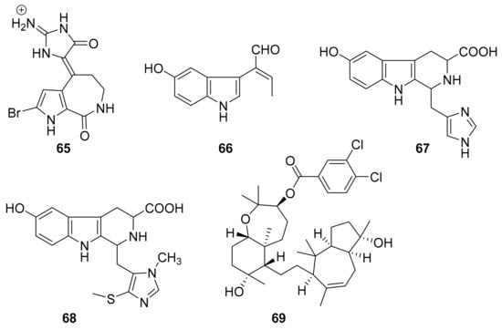 In the time period covered in this review, 42 new natural product kinase inhibitors (65–106) were reported after being isolated from marine sponges. These are listed in Table 6, shown by structure in Figure 19, Figure 20, Figure 21, Figure 22, Figure 23, Figure 24, Figure 25 and Figure 26 and Scheme 2, Scheme 3, Scheme 4 and Scheme 5, and described in detail in the following paragraphs.