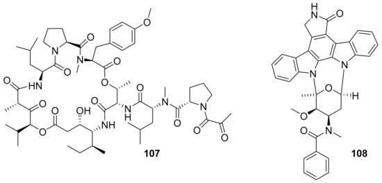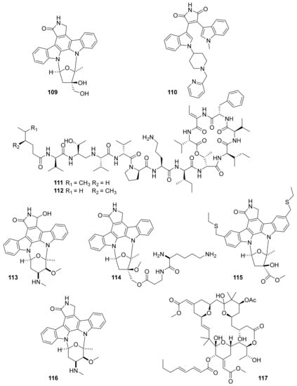 In 2018, Biao Zhou et al. 15 staurosporine derivatives from the marine bacterium Streptomyces sp. NB-A13 [42]. Among these, six were new (16–21; Figure 8), and each one except for 16 inhibited PKC-θ (IC50 0.06 to 9.43 μM) [42]. The most active of them was compound 21, which also inhibited SW-620 cells in vitro (IC50 = 9.99 nM) at even greater potency than staurosporine (IC50 = 25.10 nM) [42]. Structurally, compound 21 bears an additional hydroxy group in the bis-indole ring system that is shared with staurosporine, indicating one possible avenue for medicinal chemistry optimization of other molecules in this chemical class.