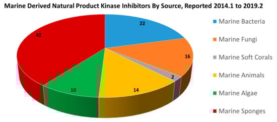 Marine-derived natural products include a wide range of molecular classes such as alkaloids, macrolides, polypeptides, and terpenoids, and have different and interesting structures that play an important role in biological activities and clinical drug applications. As it pertains to the kinase research, a number of marine-derived kinase inhibitors have come from many different sources and target many different protein kinases (Figure 2). In the last five years covered in this review, from 2014–2019, there have been many results reported in the kinase research, and accordingly new biologically active kinase inhibitors that were discovered from various ocean life forms that include bacteria and cyanobacteria, fungi, animals, algae, soft corals and sponges. The initial reports of these natural product small molecules most typically include some rudimentary bioactivity test data, and further research can or does go on to explore more deeply the pharmacological potential of each. The new natural products reported during the period of this review are described systematically in the following sub-sections, divided by the source organisms reported for each.