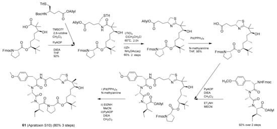 Apratoxin A is a cyanobacterial, or “blue-green algal”, natural product macrocycle that was first reported by Luesch et al. in 2001 as a product of a hybrid polyketide synthase-nonribosomal peptide synthetase (PKS/NRPS) biosynthetic pathway [83]. In 2017, Wei-Jing Cai et al. later designed and synthesized a series of cyclic depsipeptides based on apratoxin A, including apratoxin S10 (61, Scheme 1) [76]. This analogue of apratoxin A was selected as a desirable drug lead with cancer cell growth (IC50 = 5.97 nM against HCT116) and RTKs inhibitory activity [76]. The synthetic route of generating apratoxin S10 is depicted in Scheme 1. The synthesis of apratoxin S10 followed the reported strategy used to produce the lead compound, apratoxin A, with some modification to introduce new functionality [76].