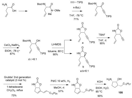 - Kwon, Y.; Song, J.; Bae, H.; Kim, W.J.; Lee, J.Y.; Han, G.H.; Lee, S.K.; Kim, S. Synthesis and Biological Evaluation of Carbocyclic Analogues of Pachastrissamine. Mar. Drugs 2015, 13, 824–837. [Google Scholar] [CrossRef] [PubMed]