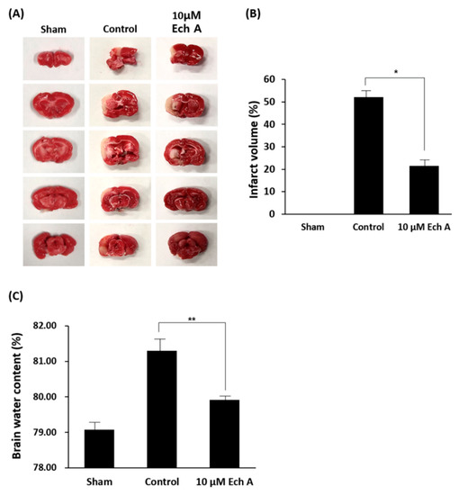 To confirm the mitigative effect of Ech A on cerebral ischemic disease, rat MCAo models were exposed to 10 μM Ech A and subsequently assessed for brain infarct volume and water content. We used 2,3,5-triphenyltetrazolium chloride (TTC) staining, one of the most conventional methods, to visualize the infarct region of the ischemic cerebrum. Ech A substantially shows the visual recovery reducing the brain infarct volumes at 7 days after reperfusion (Figure 1A). Alleviation of the injured area after exposure to Ech A was confirmed by comparing the percentage of white region in the control brain with the Ech A treatment group through TTC staining (Sham: 0.0%, control group: 52.7%, 10 μM Ech A: 21.9%) (Figure 1B). Next, we investigated the water content of rat MCAo model brain tissue, which is a marker of severe ischemic injury [13]. The water content is used to signify the ischemic brain edema in the infarct hemisphere [14], and to examine the effect of Ech A treatment on the blood–brain barrier (BBB) leakage in this study. Cerebral edema plays a key role in fatal outcomes associated with numerous neurological conditions, including ischemic stroke [15]. The percentage of water content in the control group was increased, as compared to the sham group. The Ech A-treated group revealed decreased water content as compared to the control group (sham: 79.4%, control: 81.7%, 10 μM Ech A: 80.3%) (Figure 1C). Taken together, we construe that Ech A presents the visual restoration in the infarct cerebrum of rat MCAo models. However, the functional recovery and the reparative mechanism by Ech A treatment on brain ischemic disease remain to be identified.