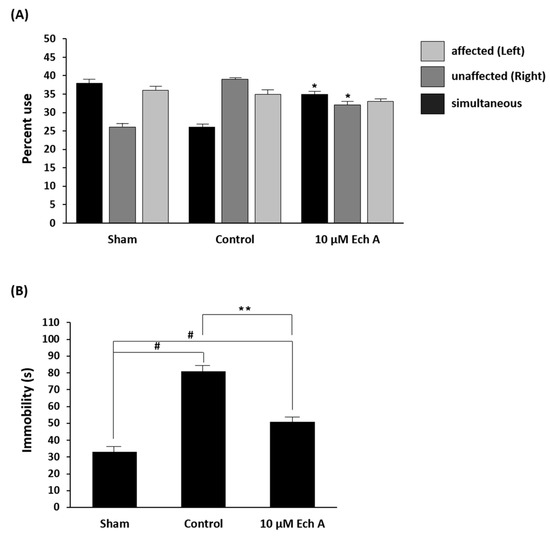 Functional assessments were applied to determine behavioral changes in the rat model for aggressive central nervous damage [16]. Two methods, namely, the cylinder test and swim test, were adopted and modified. The cylinder test evaluates the frequency of forelimb use and asymmetric movement in postural weight support [17]. In the cylinder test, cerebrally injured rats (control group) exhibited increased asymmetry use, especially practical use of the unaffected forelimb, when compared to the sham group. Furthermore, the 10 μM Ech A-treated group showed behavioral recovery with increased use of both forelimbs and decreased use of the unaffected forelimb, as compared to the control group (simultaneous use: sham 38.0%, control 26.0%, 10 μM Ech A 35.0%; unaffected use: sham 26.0%, control 39.0%, 10 μM Ech A 32.0%) (Figure 2A).