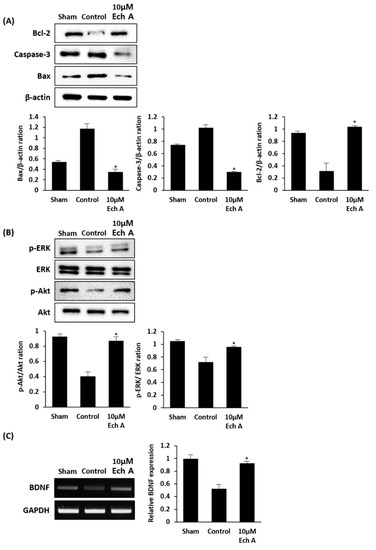 Ech A treatment in cerebral injured brain alters the expression levels of cell viability-related factors. (A) The protein expression levels of cell survival and death regulators, such as Bcl-2, caspase-3, and Bax. (B) The protein expression levels of key players in vital cellular function regulation pathways, such as ERK and AKT. (C) The mRNA expression level of BDNF, supporting cell survival alteration in the injured brain region (* p < 0.05).