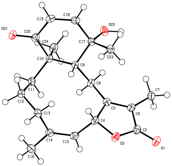 Asymmetric unit of bathyptilone A (1). Anisotropic displacement parameters were drawn at 50% probability.