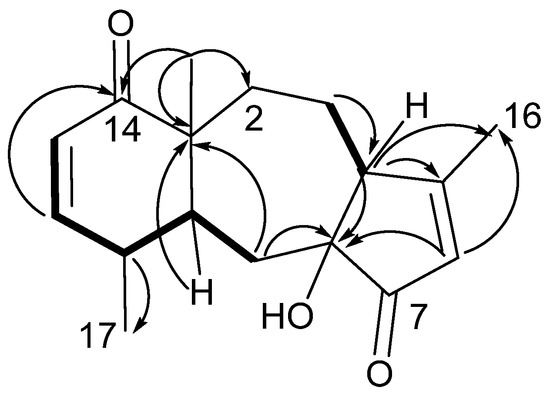 A cyclohexenone ring was constructed from COSY and HMBC data. Two 3JHH coupled olefinic protons (Figure 1), δH 6.63 (H-12) and δH 5.97 (H-13), displayed HMBC correlations to δC 203.7 (C-14), establishing an α,β-unsaturated ketone. Proton H-12 displayed further HMBC connectivity to an aliphatic methine δC 41.4 (C-10), as well as to a quaternary, oxygen-bearing carbon (δC 69.3, C-11). Proton H-13 similarly extended the cyclohexenone substructure with HMBC correlation to an aliphatic quaternary carbon (δC 50.2, C-1), which, by virtue of correlations from a methyl singlet that networked C-1, -10, -14, into the HMBC spin system, completed the cyclohexenone substructure (Figure 1). The cyclohexenone portion could be decorated at C-11 with the C-20 methyl group (δC 30.4), which displayed HMBC correlations to C-10, -11 and -12 (δC 151.7). Additional corroboration of the six-membered ring was obtained from H-10, with HMBC correlations to C-1 and C-11. This cyclohexenone partial structure has two open valences, at C-1 and C-10.