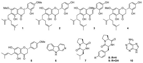 Other known compounds, (2S,2″S)-6-lavandulyl-7-methoxy-5,2′,4′-trihydroxylflavanone (4) [], 6-prenyl-4′-methoxy-5,7-dihydroxylflavanone (5) [], norharman (β-carboline) (6) [,], cyclo-(Pro-Leu) (7) [], cyclo-(Pro-Phe) (8) [], cyclo-(Pro-Tyr) (9) [], and adenine (10) [] were also isolated and characterized from the culture broth of G248 strain. Their structures were established by spectroscopic data analysis and comparison with data reported in the literature.
