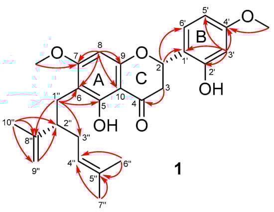 Compound 1 was isolated as yellow amorphous solid, and was optically active {[α]25D -5 (c 0.176, MeOH)}. Its positive HR-ESI mass spectrum (Figure S15) exhibited the proton adduct ion [M + H]+ at m/z 453.2270 (calcd. for C27H33O6, 453.2277) which, together with 13C NMR data, is consistent with the molecular formula of C27H32O6. The IR spectrum (Figure S16) indicated the absorption bands at νmax 3366 cm−1 (OH) and 1696 cm−1, (C=O) functionalities. In the 1H NMR spectrum (Figure S9), the presence of an ABX system at δH 6.49 (d, J = 2.3 Hz, H-3′), 6.47 (dd, J = 2.3, 8.5 Hz, H-5′) and 7.38 (d, J = 8.5 Hz, H-6′), and a singlet proton at δH 6.12 (s, H-8) was observed at the aromatic region. Additionally, the resonances of protons at δH 5.55 (H-2), 4.96 (H-4″), 4.52 (Ha-9″) and 4.59 (Hb-9″), two methoxy groups at δH 3.82 and 3.83, three singlet methyls at δH 1.48 (CH3-6″), 1.57 (CH3-7″) and 1.64 (CH3-10″) and seven aliphatic protons from 1.80 to 3.10 ppm were also noted. Analysis of the 13C NMR spectrum (Figure S10) with the aid of an HSQC experiment (Figure S12) revealed 27 carbon resonances for 1, including one ketone group (δC 193.6, C-4), ten sp2 quaternary carbons, five sp2 methines, one sp2 methylene, two sp3 methines, three sp3 methylenes, two methoxy groups and three methyls. Beside the aromatic ABX system, two other spin-spin coupling systems were revealed from the COSY spectrum (Figure S11): H-2 (δH 5.55)/CH2-3 (δH 2.67 and 2.89) (I), and CH2-1″ (δH 2.63)/H-2″ (δH 2.50)/CH2-3″ (δH 2.02)/H-4″ (δH 4.96) (II). The chemical shifts of carbons at δC 75.0 (C-2), 160.1 (C-2′), 159.0 (C-4′), 164.7 (C-5), 165.4 (C-7) and 161.9 (C-9) suggested their linkage to oxygen (Table 1). In the HMBC spectrum (Figure S13), cross-peaks of C-2″ (δC 48.2) with protons of CH3-10″ (δH 1.64) and CH2-9″ (δH 4.52 and 4.59), and those of C-8″ (δC 149.8) with protons of CH3-10″ indicated the linkage of the substructure II with the isopropenyl group through the C-2″/C-8″ bond. Additionally, HMBC correlations of C-4″ (δC 124.8) and C-5″ (δC 132.0) with protons of CH3-6″ (δH 1.48) and CH3-7″ (δH 1.57) defined the presence of a lavandulyl group in the structure of 1. The presence of the A-ring was confirmed by the HMBC cross-peaks of H-8 (δH 6.12) with C-6 (δC 109.6), C-7 (δC 165.4), C-9 (δC 161.9) and C-10 (δC 105.7). The aromatic ABX system (B-ring) was confirmed by HMBC correlations of H-3′ (δH 6.49) with C-1′ (δC 119.7), C-2′ (δC 160.1), C-4′ (δC 159.0) and C-5′ (δC 108.1). The connection of C-2 with the B-ring at C-1′ was revealed by cross-peaks of H-2 (δH 5.55) with C-1′ (δC 119.7) and C-6′ (δC 128.5). The spectral features of coupling systems I and the carbonyl group deduced from HMBC signals indicated structural similarity of 1 to flavanone compounds. Furthermore, the attachment of the lavandulyl group to the A-ring at C-6 via C-6/C-1″ linkage was revealed by HMBC cross-peaks of the protons of CH2-1″ (δH 2.63) with C-5 (δC 164.7), C-6 (δC 109.6) and C-7 (δC 165.4), and was supported by the correlations of the methoxy protons at C-7 with the protons of CH2-1″) in the ROESY spectrum of 1 (Figure S14). Finally, the two methoxy groups at δH 3.82 and 3.83 were attached to C-7 and C-4′ as indicated by their correlations in the HMBC spectrum (Figure 2). Complete analyses of 2D NMR spectra established the planar structure of 1 as 6-lavandulyl-7,4′-dimethoxy-5,2′-dihydroxylflavanone.