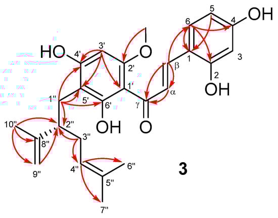 Analysis of 2D NMR spectra of 3 (Figures S30–S32 and S34) confirmed the presence of the A and B-rings, and the lavandulyl substructure. Additionally, cross-peaks of H-β at δH 8.02 with C-2 (δC 160.3), C-6 (δC 131.6) and carbonyl carbon C-γ (δC 194.8) in the HMBC spectrum (Figure S32) indicated a chalcone skeleton for 3 (Figure S36). The methoxy group at C-2′ was revealed by an HMBC correlation of C-2′ at δC 162.3 with the methoxy protons at δH 3.91 (Figure 3). As in the case of compounds 1 and 2, the location of the lavandulyl group at C-5′ was established by the HMBC cross-peaks of C-4′ (δC 164.1), C-5′ (δC 108.9) and C-6′ (δC 166.6) with the protons of CH2-1″ (δH 2.65). The planar structure of 3 was finalized as 5′-lavandulyl-2′-methoxy-2,4,4′,6′-tetrahydroxylchalcone. This compound has the same planar structure as kuraridin, which was previously isolated from Albizzia julibrissin []. The optical rotation activity of kuraridin {[α]D20 +1.2 (c 0.025, MeOH)} [] is opposite to that of compound 3 {[α]D25 –1.8 (c 0.54, MeOH)}, and the absolute configuration at C-2″ of kuraridin has not been reported.