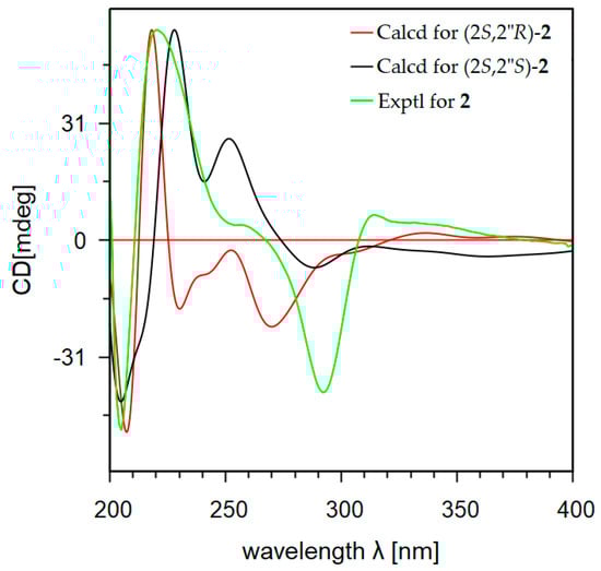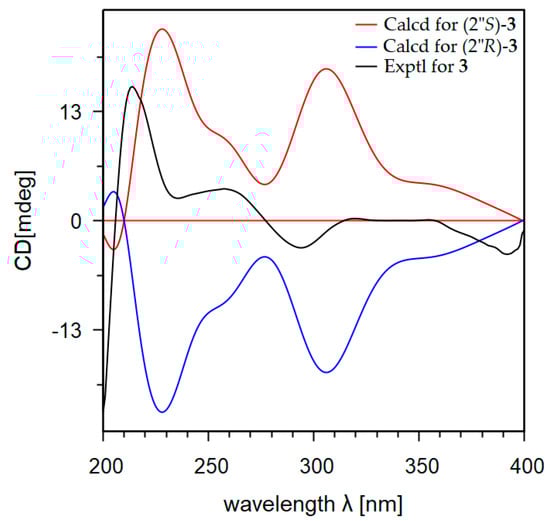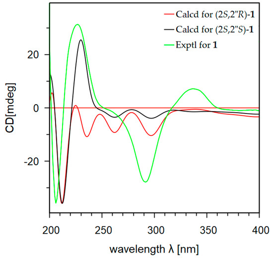 Absolute configurations of the compounds 1–3 were resolved by comparison of their experimental and calculated electronic circular dichroism (ECD) spectra [,]. The ECD quantum chemical calculations were performed using the Gaussian 09 software []. To obtain minimum energy conformers, geometry optimization of each possible isomer of these compounds was conducted (Tables S1–S5 and Figures S4–S8). The calculated ECD spectra of compounds 1–3 were generated using the time-dependent density functional method at the B3LYP/LanL2DZ level. Since the circular dichroism (CD) spectrum of compound 1 (Figure S17) had a positive Cotton effect at 337 nm (Δε +3.6) and a negative Cotton effect at 291 nm (Δε −7.7), the S-configuration was thus assigned for carbon C-2 of 1 []. The ECD spectra of the two possible diastereomers (2S,2″S)-1 and (2S,2″R)-1 were generated. As shown in Figure 4, the ECD spectrum of (2S,2″S)-1 was similar as the experimental CD spectrum of 1, while an ECD spectrum of (2S,2″R)-1 displayed the opposite Cotton effect at 233 nm. The S-configuration was thus assigned for the chiral carbon C-2″ of 1. Similarly, the S-configuration at C-2 was determined for 2 by the observation of a positive Cotton effect at 315 nm (Δε +0.8) and a negative Cotton effect at 291 nm (Δε −5.9) in the CD spectrum of 2 (Figure S27). By comparison of the ECD spectra of the two diastereomers (2S,2″S)-2 and (2S,2″R)-2 with the experimental CD spectrum of 2 (Figure 5), the S-configuration was also assigned for C-2″ of 2. The ECD of (2″S)-3 was in good agreement with the experimental CD spectrum of 3 (Figure S37). This observation allowed determination the S-configuration for carbon C-2″ for 3 (Figure 6). Since the optical rotation activities of 2 and 3 are comparatively opposite with kushnol F and kuraridin, respectively, the absolute configuration at C-2″ of kushnol F and kuraridin would most likely be R, however further experiments are required to state this definitively.