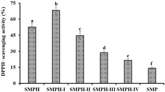 DPPH· scavenging activity of SMPH and its fractions by ultrafiltration at the concentration of 10.0 mg protein/mL. All data are presented as the mean ± SD (n = 3). a–e Values with the same superscripts indicate no significant difference (p > 0.05).