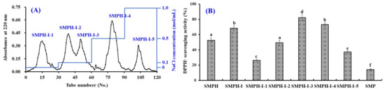 Elution profile of SMPH-I in DEAE-52 cellulose anion-exchange chromatography (A) and DPPH· scavenging activity of SMPH-I and its fractions at the concentration of 10.0 mg protein/mL (B). All data are presented as the mean ± SD (n = 3). a–f Values with the same superscripts of this type indicate no significant difference (p > 0.05).