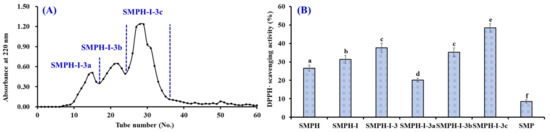 Elution profile of SMPH-I-3 in Sephadex G-25 chromatography (A) and DPPH· scavenging activities of SMPH-I-3 and its fractions at 5.0 mg protein/mL concentration (B). All data are presented as the mean ± SD of triplicate results. a–f Values with the same superscripts indicate no significant difference (p > 0.05).
