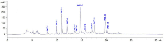 The chromatography isolation process was performed according to previous methods [48,49]. Five milliliters of an SMPH-I solution (40.0 mg/mL) were injected into a pre-equilibrated DEAE-52 cellulose column (1.6 × 80 cm) and separately eluted with 150 mL of DW, 0.1 M NaCl, 0.5 M NaCl, and 1.0 M NaCl solution at a flow rate of 1.0 mL/min. Each eluate (5.0 mL) was collected and detected at 214 nm. Finally, five fractions (SMPH-I-1 to SMPH-I-5) were prepared on the chromatogram. Five milliliters of SMPH-I-3 were separated on a column of Sephadex G-25 (2.6 × 160 cm) eluted with DW at a flow rate of 0.6 mL/min. Each eluate (3.0 mL) was collected and measured at 214 nm. Three fractions (SMPH-I-3a to SMPH-I-3c) were prepared on the chromatogram. Five milliliters of SMPH-I-3c were further purified using RP-HPLC with a Zorbax, SB C-18 column (4.6 × 250 mm, 5 µm) on an Agilent 1260 (Santa Rosa, CA, USA). The sample was eluated with a linear gradient of ACN (0–40% in 0–30 min) in 0.1% TFA at a flow rate of 1.0 mL/min. Twelve major peaks (SMP-1 to SMP-12) were isolated on the absorbance at 214 nm.