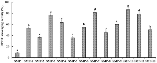 DPPH· scavenging activities of twelve major sub-fractions (SMP-1 to SMP-12) of SMPH-I-3c at the concentration of 5.0 mg protein/mL. All data are presented as the mean ± SD (n = 3). a–g Values with the same superscripts indicate no significant difference (p > 0.05).
