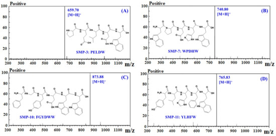 The amino acid sequences and molecular mass of four APs (SMP-3, SMP-7, SMP-10, and SMP-11) were determined using a protein sequencer and a quadrupole time-of-flight mass spectrometer (MS) coupled with an electrospray ionization (ESI) source, and the results are shown in Table 2 and Figure 6. The amino acid sequences of four APs were identified as Pro-Glu-Leu-Asp-Trp (PELDW, SMP-3), Trp-Pro-Asp-His-Trp (WPDHW, SMP-7), Phe-Gly-Tyr-Asp-Trp-Trp (FGYDWW, SMP-10), and Tyr-Leu-His-Phe-Trp (YLHFW, SMP-11). The detected MWs of SMP-3, SMP-7, SMP-10, and SMP-11 agreed well with their theoretical masses (Table 2).