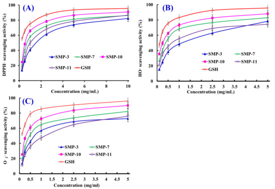 DPPH· (A), HO· (B), and · (C) scavenging activities of four APs (SMP-3, SMP-7, SMP-10, and SMP-11) from protein hydrolysate of Spanish mackerel (S. niphonius) muscle. Glutathione (GSH) was used as the positive control. All data are presented as the mean ± SD (n = 3).