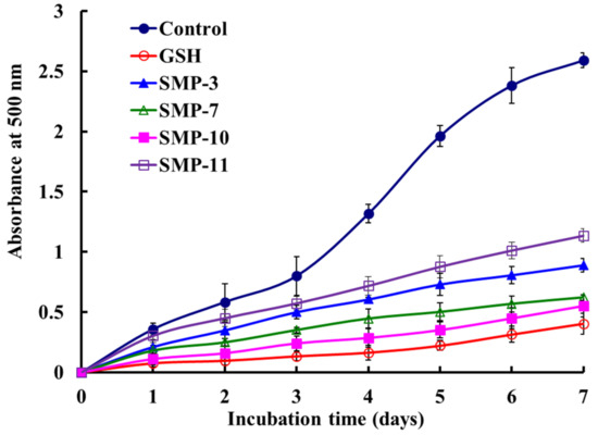 The inhibiting abilities of SMP-3, SMP-7, SMP-10, and SMP-11 on the lipid peroxidation system were expressed as the absorbance of 500 nm, and the higher absorbance of the sample group illustrated lower antioxidant capacity [31]. Figure 8 shows that the absorbance of the SMP-10 group was significantly lower than those of SMP-3, SMP-7, SMP-11, and the negative control (without antioxidant), but slightly higher than that of the positive control of GSH. The data indicate that SMP-10 had the highest ability of lipid peroxidation inhibition among four APs.