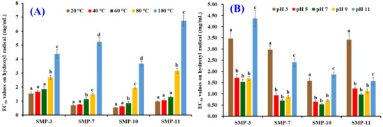 Figure 10A shows that the effects of temperature on HO· scavenging activity of SMP-3, SMP-7, SMP-10, and SMP-11 (expressed as an EC50 value). No significant difference in EC50 values of SMP-3 and SMP-11 was found when the treated temperature was 20, 40, and 60 °C (p > 0.05), but their EC50 values significantly increased when the treated temperatures increased to 80 and 100 °C (p < 0.05). Compared with SMP-3 and SMP-11, thermal treatment had stronger effects on SMP-7 and SMP-10 because their EC50 values treated at 60 °C were significantly (p > 0.05) higher than those of SMP-7 and SMP-10 treated at 20 and 40 °C (p < 0.05). The results indicate that SMP-3 and SMP-11 could retain their antioxidant activity when the treated temperature was lower than 60 °C, but SMP-7 and SMP-10 would lose their function at the same processing temperature. Figure 10B shows the EC50 values of SMP-3, SMP-7, SMP-10, and SMP-11 on HO· when they were treated at a pH value ranging from 3 to 11. No significant difference on EC50 values of SMP-3, SMP-7, SMP-10, or SMP-11 was found when pH value ranged from 5 to 9, but pH values of 3 and 11 significantly affected the EC50 values of SMP-3, SMP-7, SMP-10, and SMP-11 (p < 0.05).