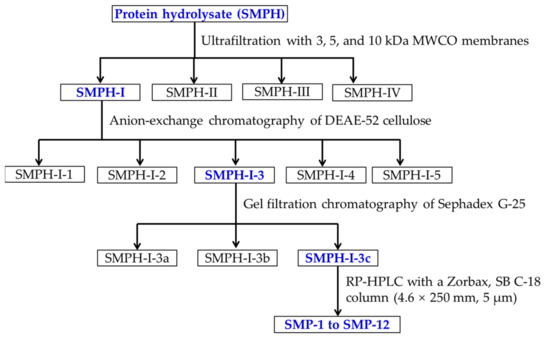 Figure 11 shows the flow diagram of isolating APs from SMPH. SMPH was fractionated using ultrafiltration with 3, 5, and 10 kDa MWCO membranes (Millipore, Hangzhou, China), and four fractions termed SMPH-I (MW < 3 kDa), SMPH-II (3 kDa < MW < 5 kDa), SMPH-III (5 kDa < MW < 10 kDa), and SMPH-IV (>10 kDa) were collected and lyophilized.