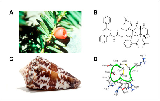 Natural sources of potential therapeutics. (A) The needles and berries of a Pacific yew, characteristic of the tree from which paclitaxel was originally extracted. (B) Chemical structure of paclitaxel. (C) Shell of the worm-hunting snail, Conus regius, from which RgIA was originally characterized. (D) Structure of the short 13-amino-acid peptide RgIA isolated from Conus regius. Image sources: (A) Yew Needles and Berries, National Cancer Institute Visuals Online, no. AV-9100-3761. (C) Conus regius photograph by Peter Huynh.