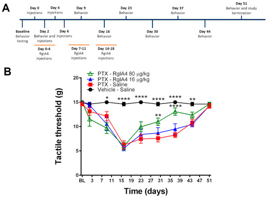 Semisynthetic taxanes, including paclitaxel, are first-line treatments for the most common solid tumors, but taxane-induced peripheral neurotoxicity is a frequent dose-limiting side effect. Sprague Dawley (SD) rats are commonly used to model paclitaxel-mediated CIPN due to the consistent induction of mechanical and thermal allodynia and ease of behavioral readouts compared to mice [30,31,32]. A clinical formulation of paclitaxel was chosen in order to induce a longer-lasting neuropathic pain effect [31]. Adult SD rats were injected four times intraperitoneally (IP) with paclitaxel (2.0 mg/kg) on days 0, 2, 4, and 6, for a total dosage of 8.0 mg/kg. Over the course of the paclitaxel injections and over the next 12 days, rats were also administered daily subcutaneous (SC) injections of RgIA4 at 16 and 80 µg/kg five days per week (days 0–18) (Figure 2A). To assay for mechanoreceptive properties of paclitaxel-induced neuropathic pain, SD rats were tested through hindpaw von Frey analysis.