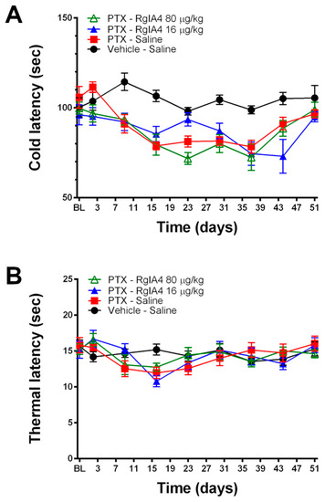 Painful neuropathies caused by oxaliplatin and paclitaxel share some commonalities of neuronal inflammation, altered ion-channel-expression and excitability of peripheral neurons, and dose-dependent severity [69]. However, while several cellular and molecular markers have been characterized in the development of these distinct neuropathies, the pathophysiology still remains poorly understood [72,73,74]. Previously, RgIA4 showed antinociceptive efficacy in oxaliplatin-treated rats with dosages as low as 0.128 μg/kg, compared to this study where effects did not become evident until 80 μg/kg [24,25]. In addition, RgIA4 showed a robust reversal of cold allodynia in these oxaliplatin models of CIPN. The reason for these differences is unknown. As such, the differential efficacy of RgIA4 in paclitaxel-treated animals, as compared to previously-reported oxaliplatin-treated animals, may provide a pharmacological tool that can help investigate the distinct, yet intertwining, disease progression between these two pathologies.