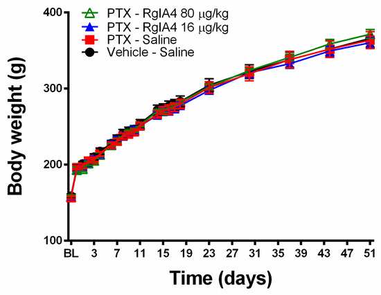 Neither paclitaxel nor RgIA4 significantly affected body weight over time. Changes in rat body weight (in g) are indicated following treatment with a total dose of 8 mg/kg paclitaxel, with or without RgIA4 at 80 or 16 μg/kg. Readings were taken from cohorts of n = 8 rats per group, unless otherwise specified. Black circles: vehicle-saline; red squares: PTX-saline; blue triangles: PTX-RgIA4 (16 μg/kg); hollow green triangles: PTX-RgIA4 (80 μg/kg). Mean +/- SEM are indicated.