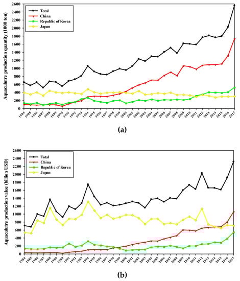 Global aquaculture production of the dominant production regions of the laver: (a) production quantity, (b) production value. Data (production quantity and value of ‘Laver (Nori)’ for Republic of Korea, ‘Nori nei’ for China, ‘Laver (Nori)’ for Japan) was obtained from FAO’s Fisheries and Aquaculture statistics (FishStatJ) [].