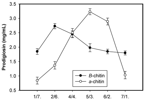 Chitin, an abundant material, has been widely produced from fishery processing byproducts. Of the natural chitin-containing materials, shrimp shells, squid pens, and crab shells have the highest chitin content [1], and as such, are used for chitin production. Chitin and its derivatives display great economic value thanks to their versatile activities and potential biotechnological applications, and chitin-containing materials have been reported to be used for the production of a vast array of bioactive products, such as exopolysaccharides [2,3,4], chitooligomers [5], antioxidants [6,7], biofertilizers [8] insecticidal materials [9,10], and biosorbents [11,12]. Recently, these chitin-containing materials were extensively used for the production of antidiabetic drugs [13,14,15,16,17,18]. In this study, chitinous materials were utilized for the production of prodigiosin, an active anticancer compound, via microbial fermentation.