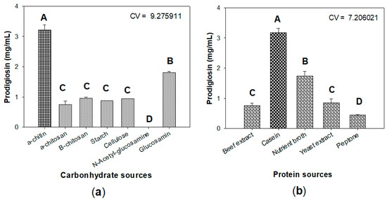 To investigate the effect of C/N sources on PG production by S. marcescens TKU011, some chitinous materials, including chitosan (a derivative of chitin), N-acetyl-glucosamine (monomer of chitin), glucosamine (mono of chitosan), and some other carbon sources, such as cellulose and starch, were used for fermentation. As shown in Figure 2a, among various tested carbon sources, α-chitin displayed the most suitable substrate for PG production by S. marcescens with the greatest yield of 3.21 mg/mL, followed by its monomer N-acetyl-glucosamine with the PG yield production of 1.81 mg/mL, and all other tested carbon source give low yield PG production (≤ 0.96 mg/mL). Thus, α-chitin was chosen as an excellent substrate for further investigation. To further investigate the effect of the combination of α-chitin and free protein source, a total of five protein sources—beef extract, casein, nutrient broth, yeast extract, and peptone—were combined with α-chitin used as sole C/N source for fermentation by Serratia marcescens to produce PG. The experimental results in Figure 2b showed that the combination of casein and α-chitin gave a significantly higher yield of PG (3.31 ± 0.142 mg/mL) than other combinations (≤ 1.73 ± 0.166 mg/mL); casein was chosen for combination with α-chitin and used as the sole C/N source in our nest experiments. Casein was also found to be a suitable nitrogen source for producing PG with high level yield in several previous studies, such as maltose/casein and sucrose/casein with ratio 1/1 leading to PG yield production of 2.354 and 3.12 mg/ml, respectively [34]; 2% oral casein was mixed with some salts and used as the medium for fermentation to produce a high yield of PG with 4.28 mg/mL [23]. Differing from previous studies, we established the novel medium with the combination of abundant chitinous material (α-chitin) and casein with the ratio of 5/3 (w/w). This designed medium also reached the high PGs yield of 3.21 mg/mL, and as such used for next investigation.