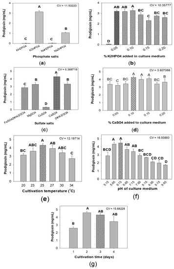 The effect of phosphate salts (a,b), sulfate salts (c,d), cultivation temperature (e), pH of culture medium (f), and cultivation time (g) on the prodigiosin production by S. marcescens TKU011. Medium with the combination of α-chitin and casein with the ratio of 5/3 (w/w). The culture medium containing 1.5% C/N source, 0.1% FeSO4(NH4)2SO4 (a,b), 0.05% K2HPO4 (c,d). The fermentation was performed at 30 °C in 1 d, and then at 25 °C in the next 2 d, shaking speed of 150 rpm, and a ratio volume of medium: flask of 1:2.5 (v/v). Means of prodigiosin yield (mg/100mL) values with the same letter in each figure are not significantly different based on Duncan’s multiple range test (alpha = 0.01).