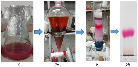 The purification and isolation process of prodigiosin. The culture broth containing prodigiosin (a) was extract by ethyl acetate (b). The crude prodigiosin was further separated by silica gel column (c) and then isolated by thin layer chromatography (TLC) (d).