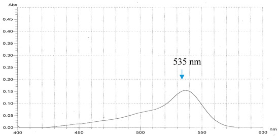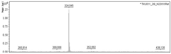 In our previous report [9], the S. marcescens TKU011 prodigiosin was identified via its UV absorption, molecular, and 1H-NMR spectrum. Due to the prodigiosin produced by the same strain, in this study, we reconfirm this purified compound by some rapid method including UV spectra and MALDI-TOF MS analysis. The purified compound demonstrated significant absorption spectroscopy at 535 nm (Figure 5) and the MALDI-TOF MS revealed a molecular weight of 324 Da for the purified PG (Figure 6), which are the specific absorption weight length and molecular weight of prodigiosin [9,33].