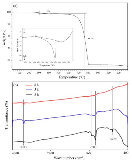(a) TGA and DSC (inset) curves of oyster shell powders heated in air. (b) FTIR spectrum of the calcined shell at 800 °C for different times.