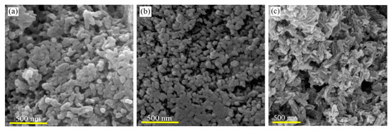 The morphology and particle size of biowaste-derived HA were studied by SEM (Figure 2). Without surfactant, agglomerated particles with irregular shapes and wide sizes were obtained (Figure 2a). To avoid particle agglomeration, CTAB and SDS were used. In the presence of CTAB, particles with sizes in the range of 50–80 nm were synthesized (Figure 2b). When SDS was used, rod-like morphologies of HA were obtained (Figure 2c). The nanorods had dimensions of 15–25 nm (diameter) and 100–150 nm (length).
