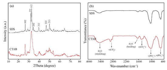 XRD patterns of the HA nanostructures synthesized in the presence of SDS and CTAB are shown in Figure 3a. All the diffraction peaks can be indexed to hexagonal phase hydroxyapatite (JCDPS No. 72-1243). The diffraction peaks at 2θ values (degree) of 25.851, 31.781, 32.221, 32.871, 34.041, 39.811, 46.691, and 49.521 are attributed to (002), (211), (112), (300), (202), (130), (222), and (213) crystal planes, respectively. No diffraction peaks related to other calcium phosphate phases like Ca3(PO4)6 could be detected. The XRD pattern of HA nanoparticles formed by CTAB shows a composite peak consisted of (211) and (112) planes at 2θ = 32°. This finding reveals the lower crystallinity of the nanoparticles than the nanorods. Based on the method explained in [46], the crystallinity degree of the HA nanostructures prepared by SDS and CTAB was about 27% and 24%, respectively.