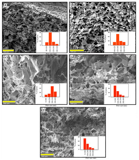 FESEM images of HA/Gel/CMC scaffolds synthesized by (a) 0.025 g CA, (b) 0.25 g CA, (c) NaCl (420–500 µm), (d) NaCl (180–250 µm), and (e) NaHCO3. The pore-size distribution was shown in the inset of each image.