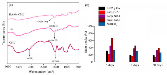 (a) FTIR spectrum of gelatin, CMC, and HA/Gel/CMC scaffolds. (b) Water uptake of HA/Gel/CMC scaffolds as a function of soaking time.