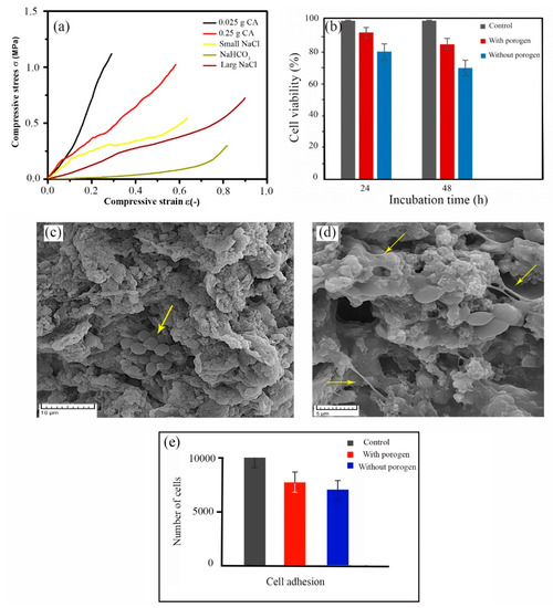 The cytotoxicity of the scaffolds was evaluated by MTT assay. Figure 6b shows the high viability of MG63 osteoblast-like cells incubated on the scaffolds synthesized with the help of NaCl particles (180–250 µm) as compared with the control. Cell viability of the scaffolds fabricated without porogen particles is lower than the scaffolds fabricated with NaCl at the same conditions. This observation may be related to the pore structure of the scaffolds, which play a key role to cell attachment and growth [51]. Figure 6c,d shows SEM images of the cells grown on the scaffolds synthesized without and with NaCl porogen (180–250 µm). The MG-63 cells attached to the scaffolds was noticed. Quantitative analysis of cell adhesion (Figure 6e) determined that about 85% and 72.5% of the cells seeded were adhered to the surface of the scaffolds synthesized with and without porogen, respectively.