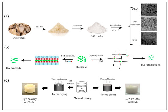 Schematic presentation of (a) HA synthesis from oyster shells, (b) effect of surfactants on the HA morphology and particle size, and (c) effect of freeze-drying and salt-porogen on the scaffolds’ porosity.