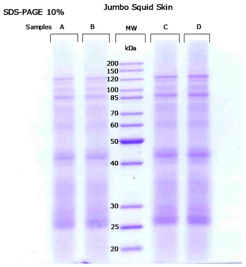 Additionally, to visualize and corroborate the intact protein extraction of the jumbo squid skin fraction, complete protein extracts of the four replicates (A–D) were separated by SDS-PAGE 10% (Figure 1). This gel illustrates that all replicate extracts show the same protein weight distribution.