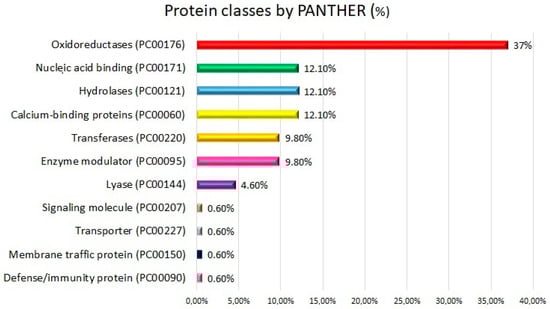 PANTHER analysis revealed the presence of 11 different protein classes in the jumbo squid skin proteome (Figure 2). The most prominent classes were oxidoreductases (37.0%), nucleic acid binding proteins (12.1%), hydrolases (12.1%), calcium-binding proteins (12.1%), transferases (9.8%), and enzyme modulator (9.8%). Thus, in the jumbo squid skin, oxidoreductases are mainly involved in the energetic metabolism, antioxidant defense and cephalopod coloration [38]. Another significant protein class is that of calcium-binding proteins, which are involved in muscle relaxation and nervous transmission in the marine skin species [39,40].