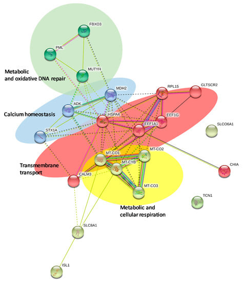 Physical direct interactions are represented with continuous lines and functional interactions with interrupted lines. The topological analysis of this network demonstrated mainly four different sub-networks. Two of them are relevant sub-networks implicated in metabolic and oxidative cellular respiration (Figure 3 in green and yellow).