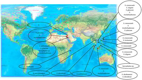 Worldwide distribution of chemically studied Sarcophyton soft coral.